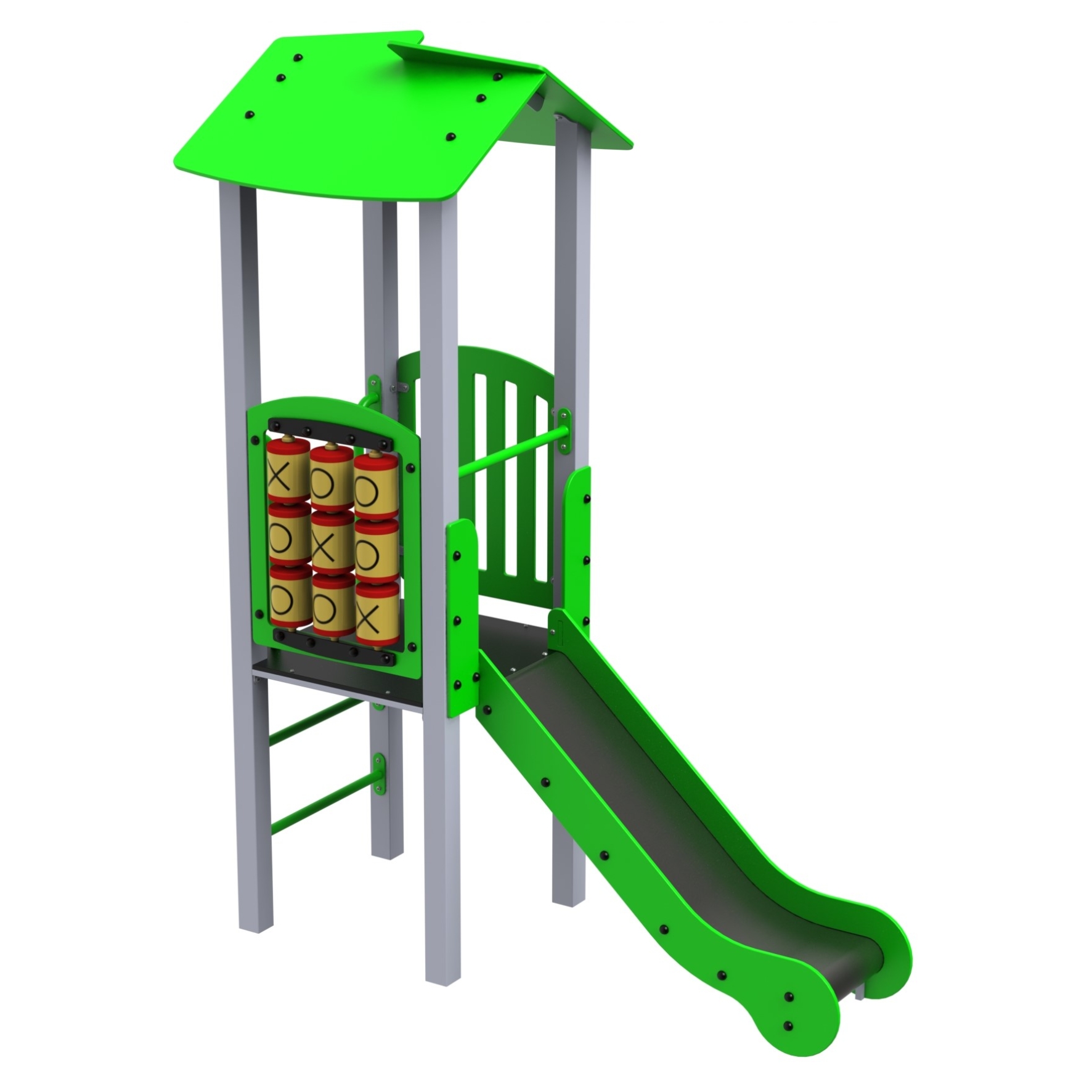 Na zestaw składa się wieża z dachem dwuspadowym, do której prowadzi drabinka pionowa. Dzieci mogą zjeżdżać z dwóch ślizgów wykonanych ze stali nierdzewnej, a także bawić się przy barierkach edukacyjnych – w tym z grą „kółko i krzyżyk”. Estetyczne wykończenie z kolorowej płyty HDPE i kompaktowe wymiary sprawiają, że zestaw idealnie nadaje się do małych przestrzeni.