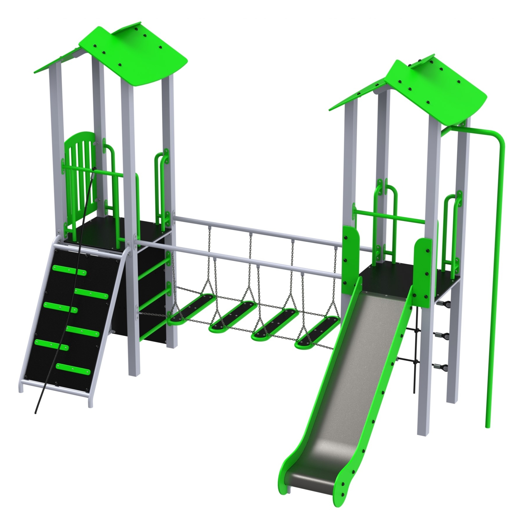 Na zestaw składają się dwie wieże z dachami dwuspadowymi, ślizg nierdzewny, różne drabinki, pomosty oraz rura strażaka. Całość uzupełniają płyta wspinaczkowa pionowa z kamieniami oraz podest z liną, które wprowadzają elementy zabawy wymagające zręczności i siły.