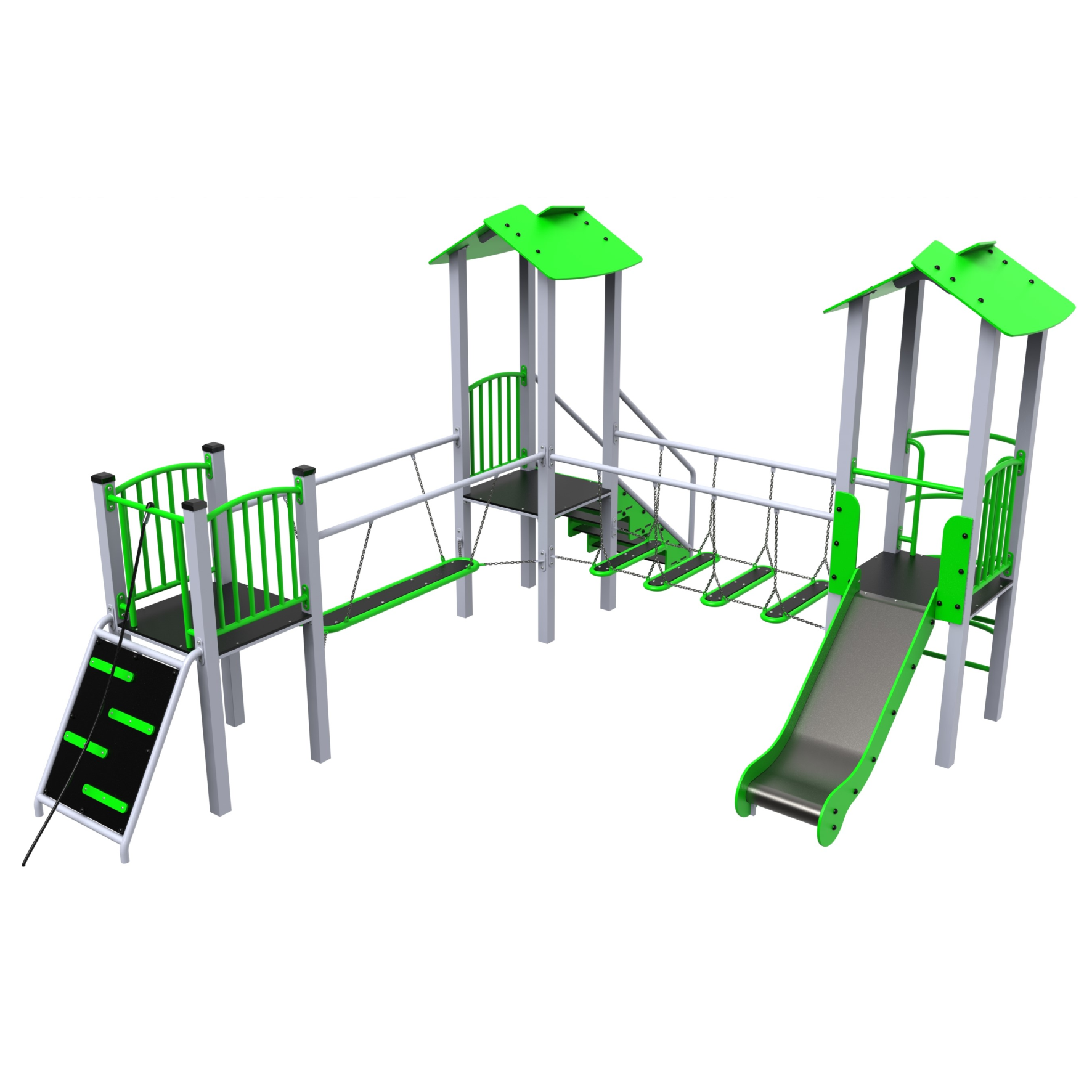 W zestawie znajdują się aż trzy wieże – dwie z daszkiem i jedna bez – połączone pomostami oraz uzupełnione o ślizg, schody, podest z liną oraz drabinki. Szczególną atrakcję stanowi linowy element wspinaczkowy, który zachęca dzieci do aktywnego i kreatywnego wykorzystania przestrzeni.
